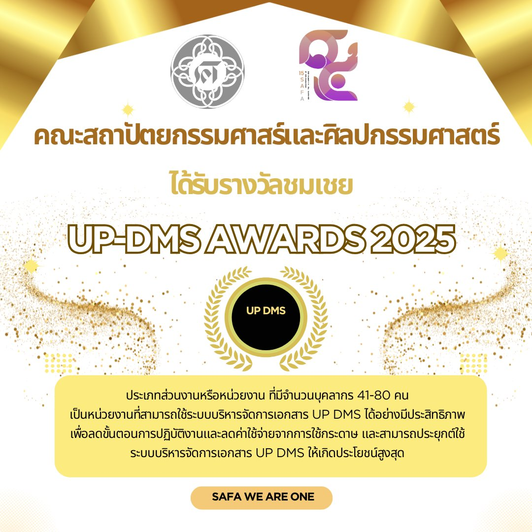 ทั้งนี้คณะสถาปัตยกรรมศาสร์และศิลปกรรมศาสตร์ ได้รับรางวัลชมเชย UP-DMS AWARDS 2025 ประเภทส่วนงานหรือหน่วยงาน ที่มีจำนวนบุคลากร 41-80 คน เป็นหน่วยงานที่สามารถใช้ระบบบริหารจัดการเอกสาร UP DMS ได้อย่างมีประสิทธิภาพ เพื่อลดขั้นตอนการปฏิบัติงานและลดค่าใช้จ่ายจากการใช้กระดาษ และสามารถประยุกต์ใช้ระบบบริหารจัดการเอกสาร UP DMS ให้เกิดประโยชน์สูงสุด